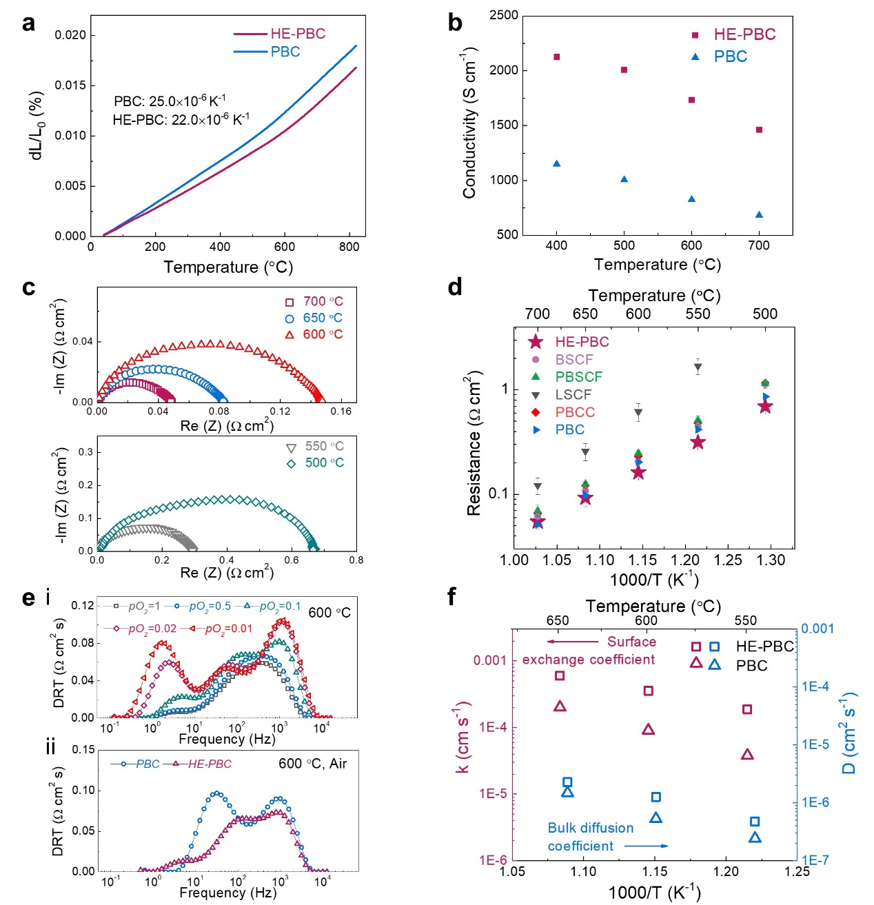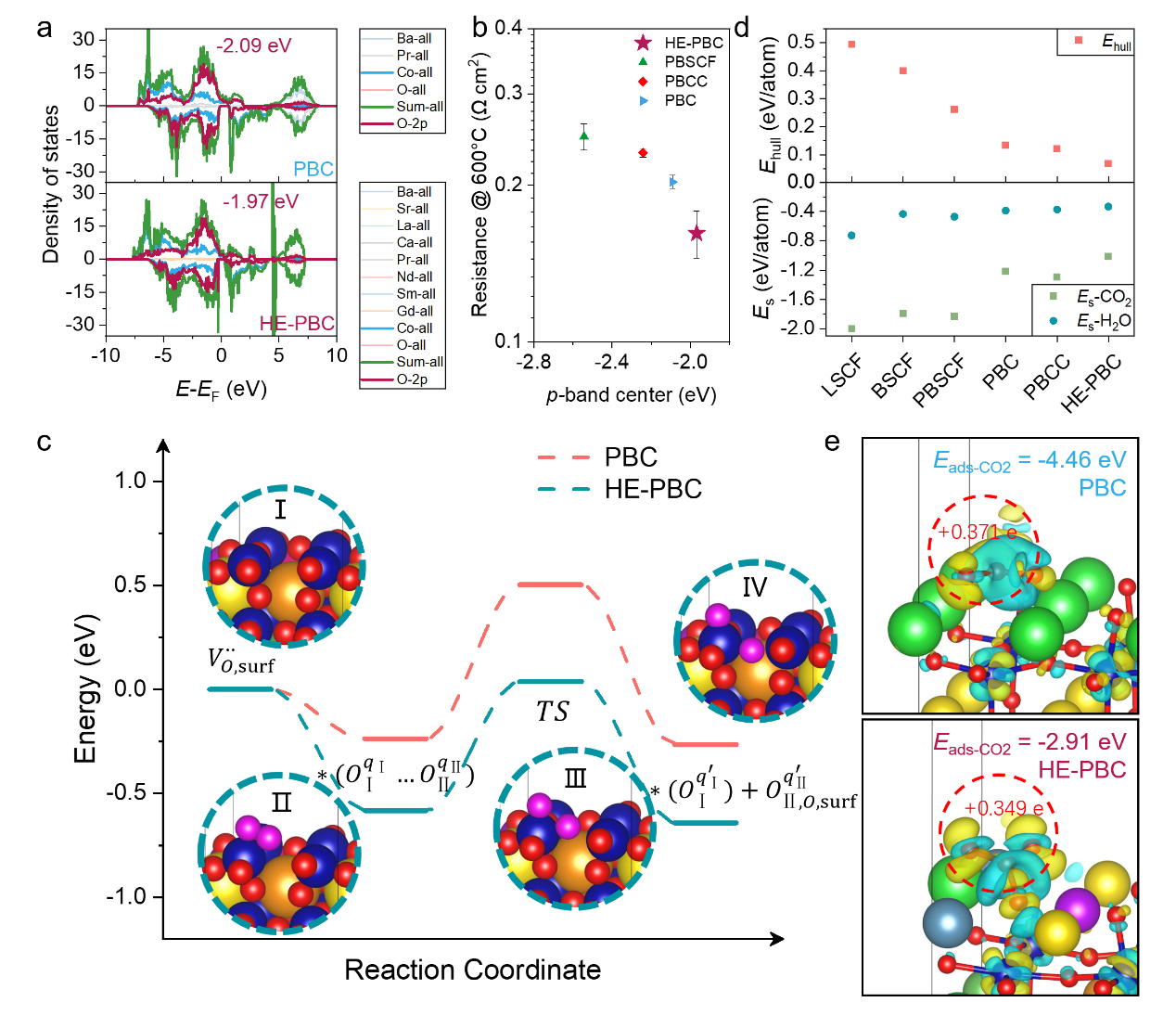 研究显示,HE-PBC电极在氧还原反应和氧析出反应中表现出优异的催化活性,其极化电阻远低于目前常用的LSCF、PBC等电极材料。同时,该材料在含CO2和H2O的高温严苛环境中也展现出卓越的耐受性,衰减速率显著降低,表明其具备在实际复杂环境中长期运行的潜力。通过第一性原理计算,研究进一步揭示了HE-PBC具有更优的p带中心位置、更低的氧解离能垒以及更弱的CO2吸附能等,从而在原子尺度上解释了其高活性和稳定性的来源。