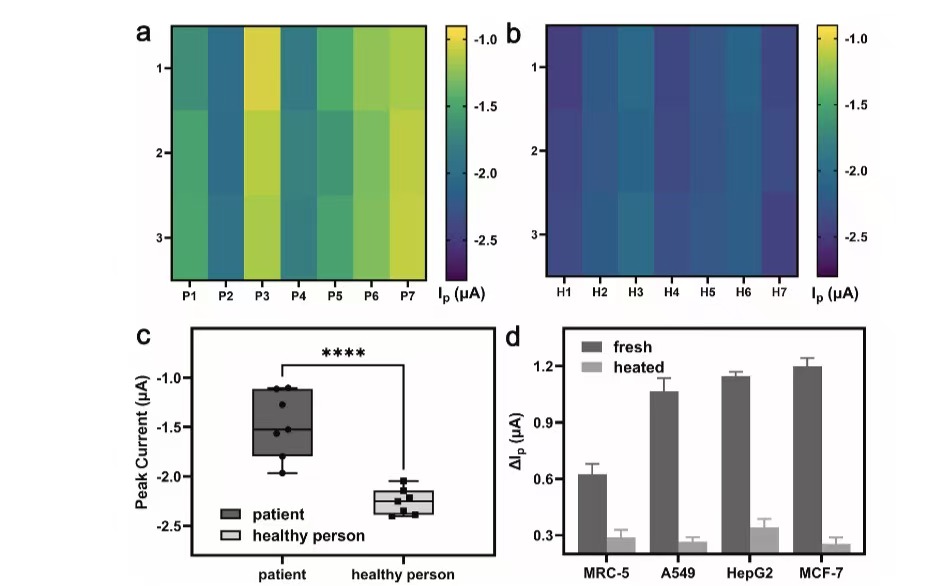 中国科学院苏州生物医学工程技术研究所前期研制了一种基于摩擦纳米发电机的传感器,利用CRISPR/Cas信号放大技术进行FEN1的高灵敏检测。为进一步降低检测成本,提升传感器便捷性,团队近期开发了一种新型的均相电化学方法,制备出电极片(SPE),确保了反应的稳定进行和信号的可靠读出。通过检测SPE反应池中的电化学信号,可实现对FEN1的超灵敏分析,检测限低至0.0114mU。该蛋白质检测方法同时表现出优异的选择性,成功地应用于抑制剂、细胞样品和临床样品的分析,有望为生物医学研究、临床诊断和药物筛选应用提供便捷快速的传感平台。