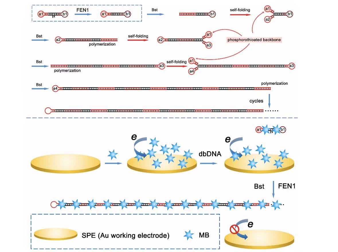 蛋白质均相电化学传感研究取得进展。蛋白质是构成生命体结构和功能的基础组成元件,执行大量细胞生理功能。瓣状核酸内切酶-1(FEN1)是一种结构特异性酶,能够识别三碱基重叠结构并对其进行切割,释放出5-flap片段。FEN1在DNA链复制、端粒维持以及DNA修复等DNA结构调控中起到重要作用,对于维持基因组的稳定性至关重要。FEN1可以作为潜在的疾病生物标志物和治疗的药物靶点。