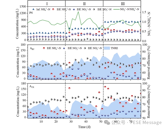 图1 部分硝化厌氧氨氧化(PN/A)系统的脱氮性能。