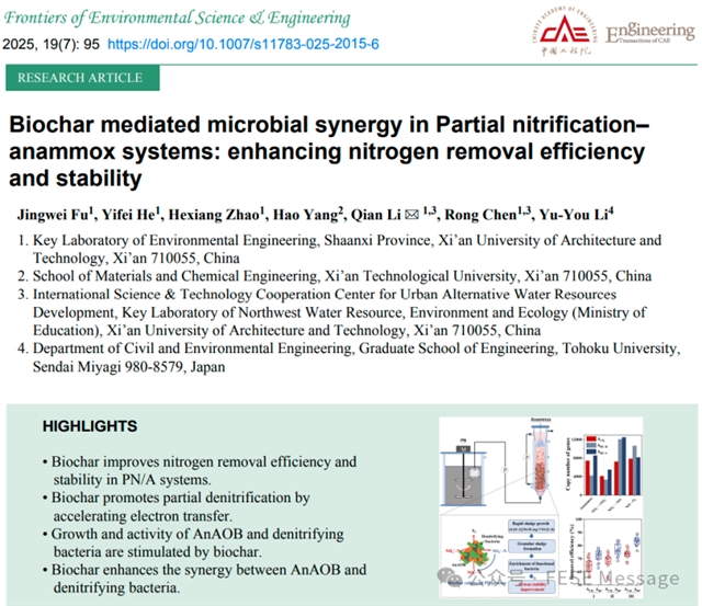 引用格式:Jingwei Fu, Yifei He, Hexiang Zhao, Hao Yang, Qian Li, Rong Chen, Yu-You Li. Biochar mediated microbial synergy in Partial nitrification–anammox systems: enhancing nitrogen removal efficiency and stability. Front. Environ. Sci. Eng., 2025, 19(7): 95 https://doi.org/10.1007/s11783-025-2015-6