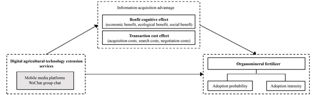 我国已出台多项政策推动有机无机复混肥的普及,但由于信息不对称,小农户特别是偏远地区农户对其重要性认识不足,对技术要领掌握有限,导致采纳率偏低。数字农业技术推广服务借助微信公众平台、手机应用等互联网媒介,突破时空限制,帮助农户获取农业技术信息,缓解信息不对称问题。已有研究表明,该服务能提升农业生产效率、增加农户收入,并促进多项绿色生产行为的采纳。然而,现有研究多关注其对一般绿色技术的影响,专门针对有机无机复混肥采纳的研究尚不充分,且对影响机制 (如效益认知与交易成本) 的系统探讨较为缺乏。