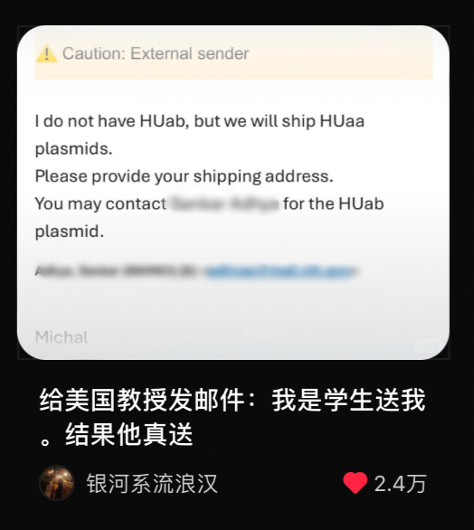 最近,留学英国的呙佳芯在社交平台发的帖子“爆”了。她在帖子中惊喜地分享,自己向一位美国加州大学伯克利分校的教授发邮件,询问对方是否可以“施舍”一份实验样品,没想到教授欣然给她快递了一份,还不让她出运费。