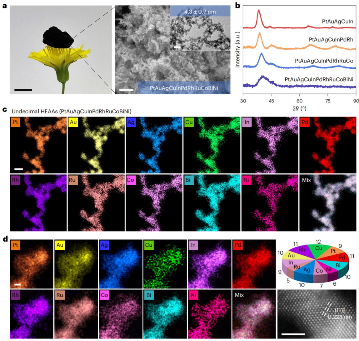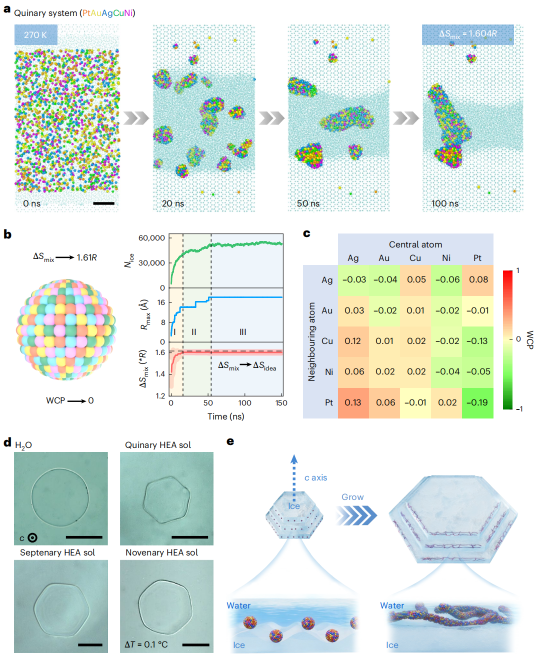 因此,有别于传统HEA纳米粒子的制备(熵驱动或焓驱动原理),HEAAs的低温合成机理源于冰介导的反应物控释,低温条件下的动力学亚稳态选择性,以及纳米金属体系在水相的独特自愈合行为的共同作用。