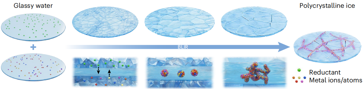 研究组开发了BLIR策略。首先将金属盐、还原剂(硼氢化钠)溶液依次淬冷,形成两层玻璃态冰(预融冰,premelted ice);伴随可控升温(在亚零度下),预融冰极缓慢地转化为小冰晶并长大(即重结晶过程),伴随着被淬冷冻住的各种反应物(不同金属离子、还原剂)无差别地、缓慢地析出到冰晶间的通道内,金属离子与还原剂可通过通道相遇而发生反应。低温下,排出与扩散过程极为缓慢,故逐步排出的各种金属离子可与还原剂充分反应形成原子(数目很少,故可避免大量原子同时生成带来的相分离)并近均匀地生长为HEA纳米粒子,而纳米粒子在冰-水界面组装为网络结构,最终在金属凝胶自愈合性质的引导下形成块体HEA凝胶。需要指出,低温环境下,纳米粒子中不同金属原子重新排布受阻,故初始形成的均相纳米粒子很难转变为热力学稳定的相分离结构;伴随纳米粒子逐渐融合生长形成网络结构,相分离所须的能量将进一步提高,初始均匀分布的各种金属原子被固定,故所获得的样品在室温下仍能保持高熵结构。