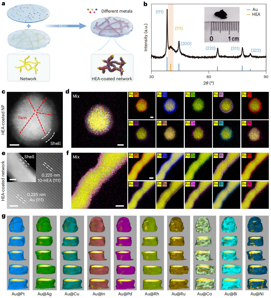 进一步,可在已形成的凝胶(如金凝胶)基础上,通过引入含多种金属离子的冰层进行二次重结晶。源于异相成核的能量优势,可在金凝胶表面生长一层HEA壳层,从而获得具有HEA壳层结构的金气凝胶。这一策略可为设计一系列新型功能材料提供新路径。