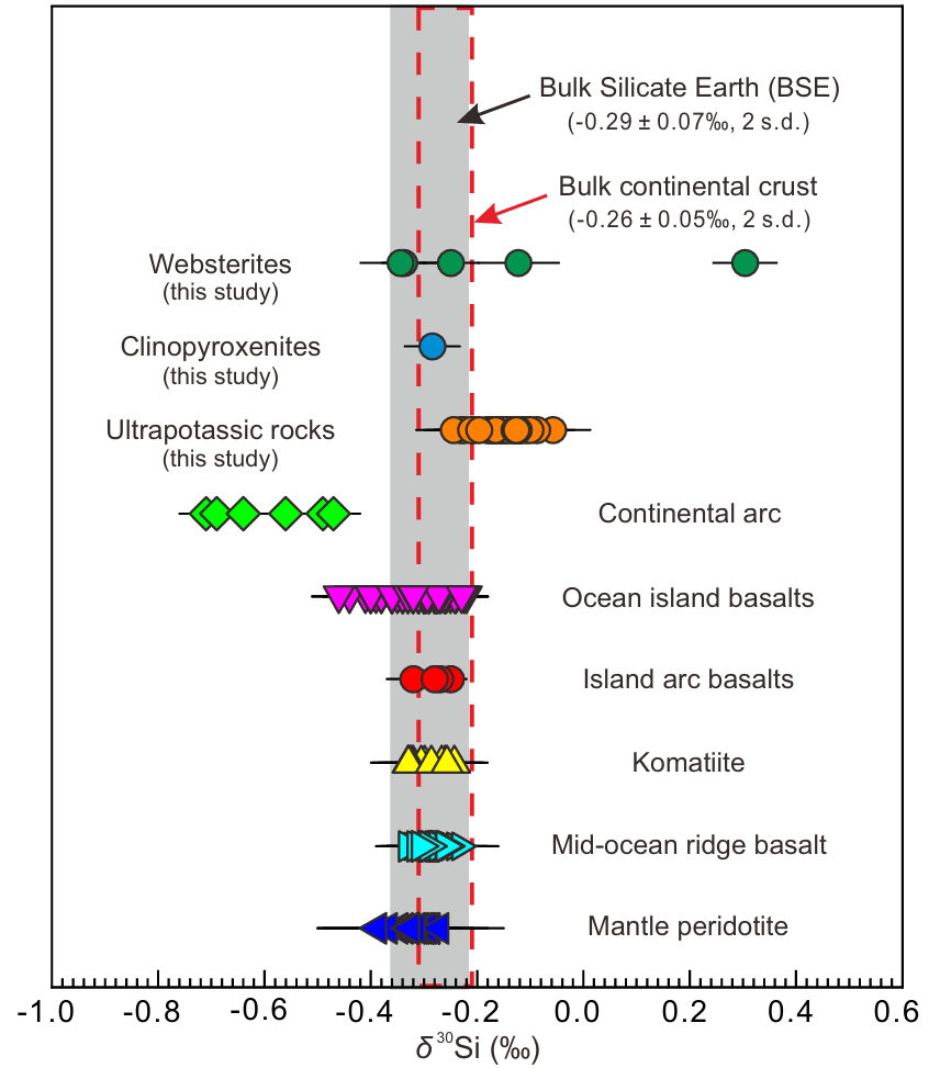 传统观点认为,地幔高温部分熔融形成新生地壳的过程不会引发显著的硅同位素分馏。并且,由于大陆地壳与全硅酸盐地球(BSE)的硅同位素组成几乎一致,所以地幔被认为与BSE具有相似的硅同位素组成,不应出现明显异常。然而,近年来研究发现,一些洋岛玄武岩和大陆弧岩浆具有显著偏轻的硅同位素组成(低于BSE),这暗示地幔中应存在一个与之互补的重硅同位素储库,以维持全球硅同位素的质量平衡。但此前报道的各类地幔岩石(包括橄榄岩、辉石岩及其熔融产物)的硅同位素数据大多等于或轻于BSE,重硅地幔储库一直未能被明确识别。