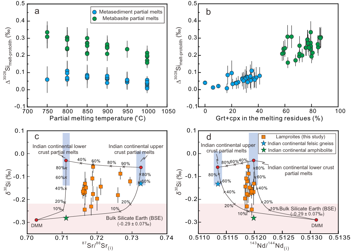 该研究聚焦喜马拉雅-青藏造山带碰撞后的钾镁煌斑岩和伴生地幔辉石岩捕虏体,系统揭示了其全岩和矿物原位硅同位素数据。这些数据呈现出独特的重硅同位素特征,为地球深部存在重硅同位素储库提供了有力新证据。通过综合岩石地球化学分析与同位素分馏模拟,团队提出该重硅同位素储库的形成与俯冲印度大陆板片熔体引发的地幔交代作用密切相关。