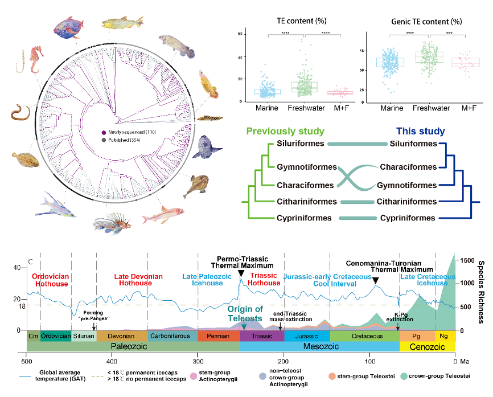 该研究通过Fish10K项目建立了目前全球最大规模的鱼类基因组资源,系统解析了真骨鱼类基因组结构特征、转座子动态、保守与创新元件、系统发育关系及演化速率,揭示了基因组复制与转座子活动在推动鱼类适应性演化中的核心作用。该成果为深入理解脊椎动物基因组演化规律、性状起源与生态适应机制奠定了坚实的数据基础。