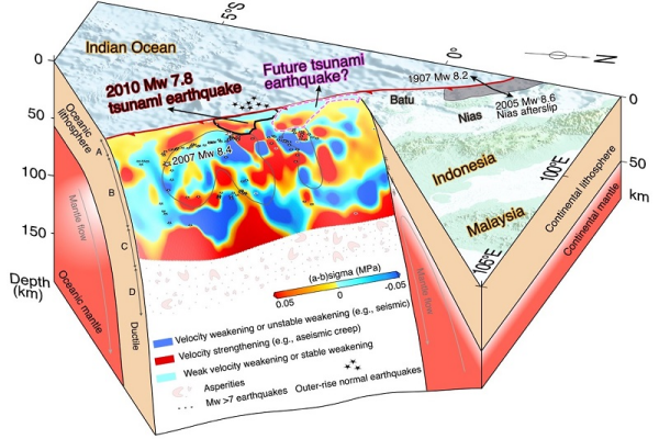 该模型再现了2007年至2010年间断层蠕滑的演化过程。结果显示,2010年破裂区域深部(约5–10千米)为“速度强化”区,在2007年地震后持续蠕滑,累积滑动达0.4米至0.8米;蠕滑向上扩展,持续加载上方海沟处约5千米深部内的“速度弱化”区,三年后使其库仑应力增加至0.2 bar,超过地震触发通用阈值(0.1 bar),可能最终导致2010年10月25日断层浅部突发7.8级海啸地震,产生超过8米滑动,触发袭击Pagai群岛高度超过11米的海浪,最大爬高约17米。