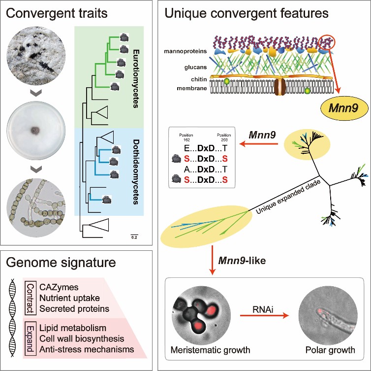 团队通过对座囊菌纲和散囊菌纲中典型石生真菌物种及其近缘非石生真菌物种,开展比较基因组学分析发现,石生真菌普遍具有基因组较小、重复序列少、基因密度高等特征;与腐生生活相关的基因数量减少,而与抗逆性相关基因明显扩张;染色质重塑和蛋白折叠相关基因受到正选择作用影响。同时,参与细胞壁生物合成的甘露糖基转移酶表现出分子趋同信号。团队通过RNA干扰实验证实,石生真菌中特异性扩张的Mnn9-like基因,不仅参与细胞壁糖蛋白合成,还调控石生真菌典型的分生组织生长方式,从而增强其对逆境的适应能力。