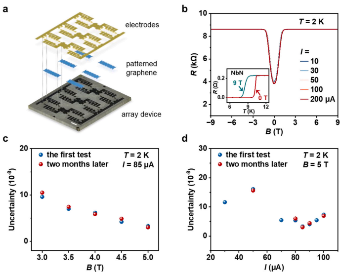 为揭示其物理机制,团队结合输运测量与ARPES,发现器件尺寸变化会导致石墨烯能带结构的细微重整化。费米速度测量进一步证实,电子—电子相互作用与尺寸效应共同改变了狄拉克锥形状,从而引起载流子密度随尺寸变化。基于此规律,团队采用支持向量回归(SVR)机器学习模型,对沟道宽度等参数进行协同优化,确定了约360μm为电阻不确定度与集成密度间的最佳平衡点,并据此制备输出量值为8.604kΩ的量子霍尔电阻阵列。该阵列在约±1.5T磁场下,即可进入量子化平台,并于85μA电流下,达到3.0×10⁻⁸的最低不确定度。