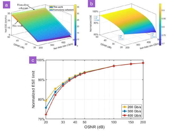通过引入香农公式,研究人员导出了各种检测系统的电谱效率理论极限值,如图2(a)所示。该值主要与系统净数据率和光信噪比(OSNR)有关。然后,所提出方案的ESE理论极限值被归一化到零差相干的情况,如图2(b)所示。为了提供一个更加清晰的视觉展示,研究人员考虑了一些特殊情况。图2(c)展示了不同的净数据率时,所提方案归一化的ESE理论极限值与OSNR的关系。随着OSNR的增加,所提出方案的ESE理论极限值逐渐趋近零差相干的理论极限值。可以预见,如果OSNR足够大,所提出方案的归一化ESE理论极限值有望接近100%。