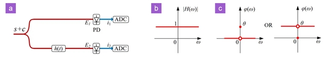 针对以上问题,近日,上海交通大学苏翼凯教授团队联合诸葛群碧副教授、西湖大学William Shieh教授和美国诺基亚贝尔实验室Haoshuo Chen博士,从传统的相位分集零差相干接收机结构出发,推导出了最优的直接检测接收机架构。该接收机由一个耦合器、两个单端光电探测器(PD)、两个模数转换器和一个具有最优传递函数的频率选择性相移器组成,如图1所示。通过联合考虑噪声和信号与信号二阶拍频项(SSBI)对系统性能的影响,最优的传递函数表现为全通的幅度响应,相位响应表现为对载波或信息承载信号施加可调的相移。在实际应用中,需要根据系统工作条件灵活选择合适的相移。在接收端DSP中,使用卷积神经网络一步完成信号重构和SSBI消除,从而最优化系统的误码率(BER)性能。