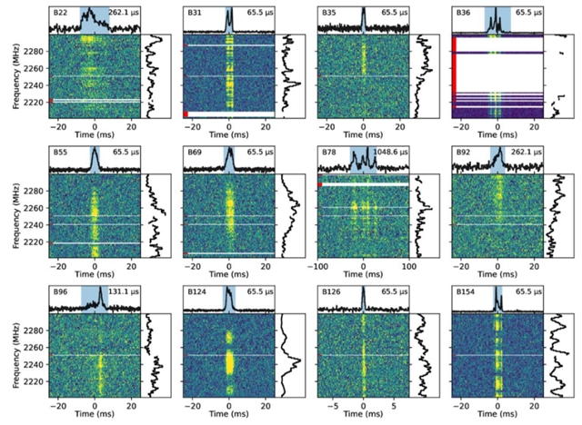 团队发挥了天马望远镜一镜双频的观测能力,对该射电暴进行2.25/8.6GHz双频同时观测。2024年1月29日至2025年2月15日,共组织66次观测,累计投入约180小时观测时间。经过一系列数据处理,团队确认了来自FRB 20240114A在2.25GHz的155次爆发。团队通过进一步分析其爆发率随时间的演化趋势发现,在2.25GHz,该源在2024年7月和2025年1月初异常活跃,相比其他观测时间平均爆发率高约将近10倍。在与此同时进行的8.60GHz观测中未能探测到对应的爆发,团队基于此结果提出,FRB 20240114A在该频率的活跃度比2.25GHz低一到两个数量级,说明其爆发和其他重复快速射电暴一样具有窄带的本征辐射特性。