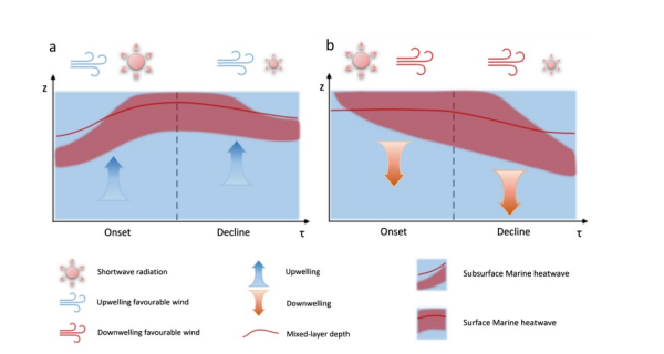 研究揭示了海洋热浪事件垂向动态转换过程。在事件的形成阶段,上升流可将次表层暖水抬升至表层,与表层异常暖水结合,形成新的表层海洋热浪;在消亡阶段,表层冷却后,残余的暖水重新聚集在次表层,形成次表层热浪。这种“表层—次表层”的往复迁移表明,海洋热浪并非孤立事件,而是连续的三维能量过程。