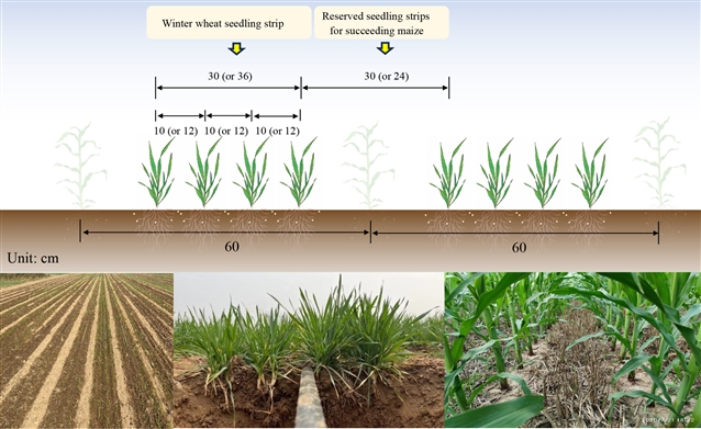 图1 华北平原冬小麦–夏玉米轮作四密一稀带状种植模式示意图。