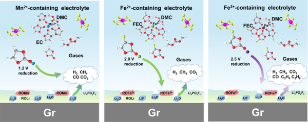 近日,中国科学院物理研究所/北京凝聚态物理国家研究中心研究团队,采用冷冻电镜技术,剖析过渡金属离子Fe(来自LiFePO4正极)和Mn(来自含Mn氧化物正极)的串扰效应,发现了一些共性问题。过渡金属离子进入电解液后,优先与电解液中的溶剂配位形成类似“溶剂-TM”,提高了电解液还原电位,并催化电解液发生双电子还原反应,使过渡金属离子以有机络合物形式沉积在SEI膜中。过渡金属离子对电解液分解具有催化作用,导致更多副反应发生和额外气体释放,破坏SEI膜完整性,使得电解液不断渗透至负极表面进而被分解。因此,在循环过程中,持续的界面副反应消耗活性锂离子,致使SEI膜呈现出“自下而上”生长模式。同时,增厚引起电池极化增加。研究还证实,过渡金属离子价态越高,对电解液的催化作用越显著,产气越多,导致SEI膜增长速度加快,使电池性能衰减越快。