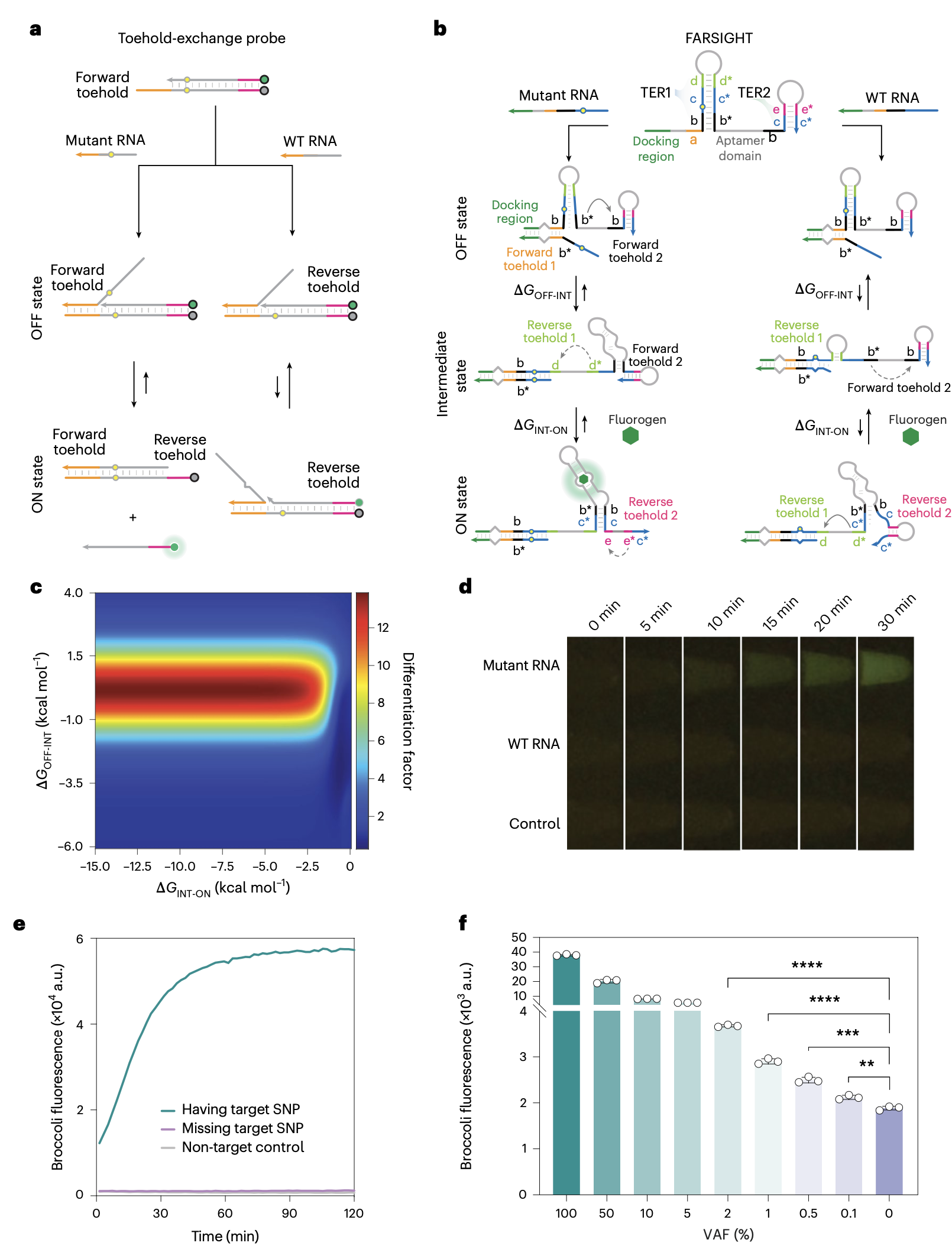 在这项工作中,Alexander Green团队开发了一种基于适配体的RNA开关技术。该技术具备单核苷酸特异性,通过无需酶的检测方法,可在15分钟内实现快速、多元的单核苷酸多态性鉴别。FARSIGHT技术具有多重显著优势:通过利用适配体的独特性质和双趾环交换机制,该技术能以极低背景干扰实现SNP的快速精准鉴别。与传统的单链核酸置换思路不同,FARSIGHT通过多米诺骨牌式分子内反应确保双链结构域的高效释放,进而实现功能适配体构象的重折叠激活。这一创新设计支持通过不同荧光适配体RNA输出实现多重检测,极大拓展了技术的应用场景。FARSIGHT展现出超高的灵敏度,在变异等位基因频率低至0.1%时仍能准确识别单核苷酸变异。此外,这项工作建立了完整的生化模型以阐明FARSIGHT的作用机制。该模型精准捕捉了反应关键步骤,包括两阶段链置换反应及荧光分子结合过程。通过系统研究模拟两步链置换反应化学平衡能对检测分辨力的影响,这项工作为该技术的设计原理与优化策略提供了重要理论依据。