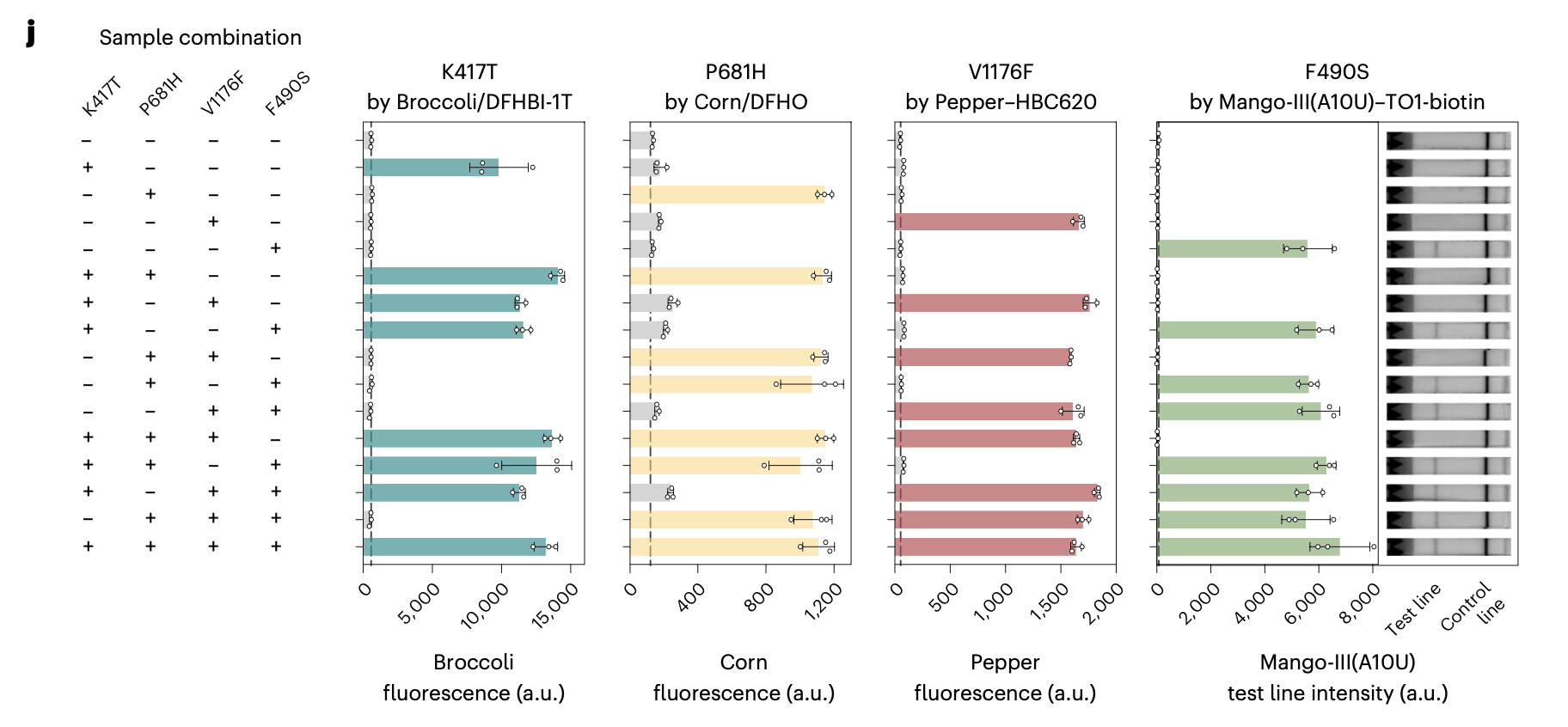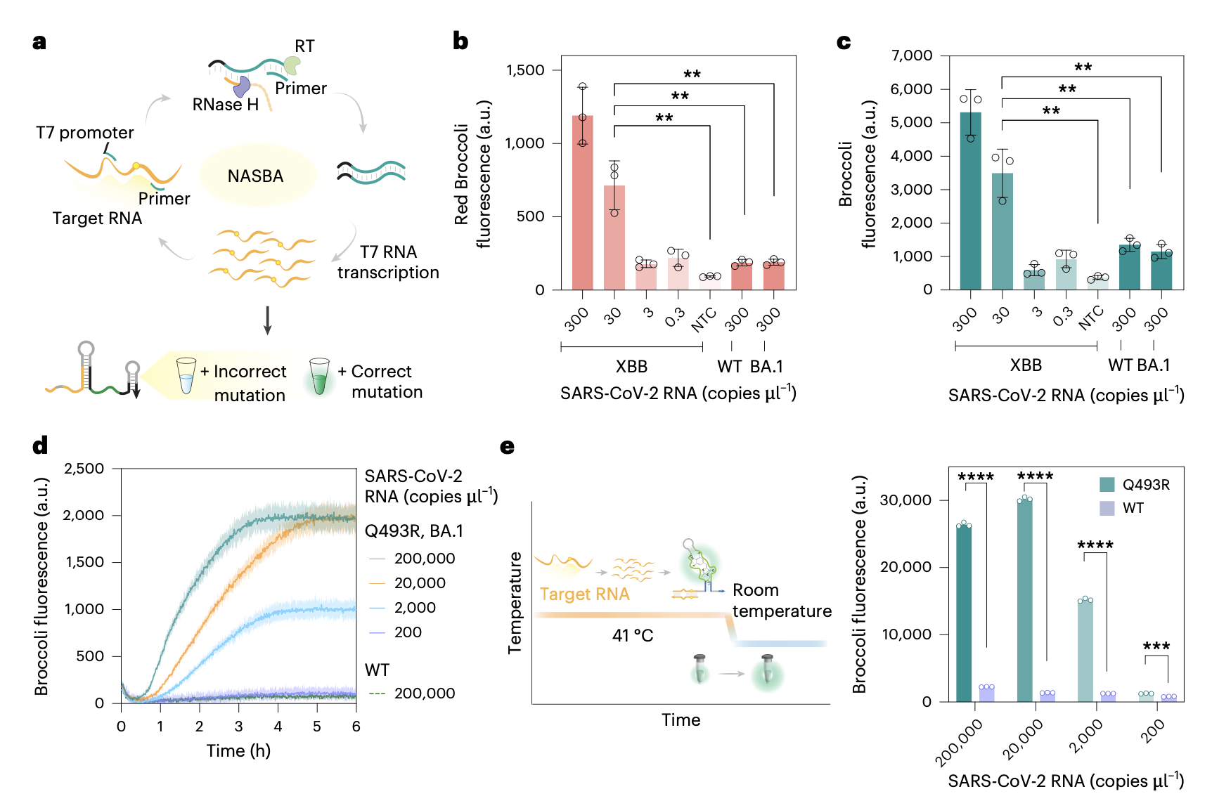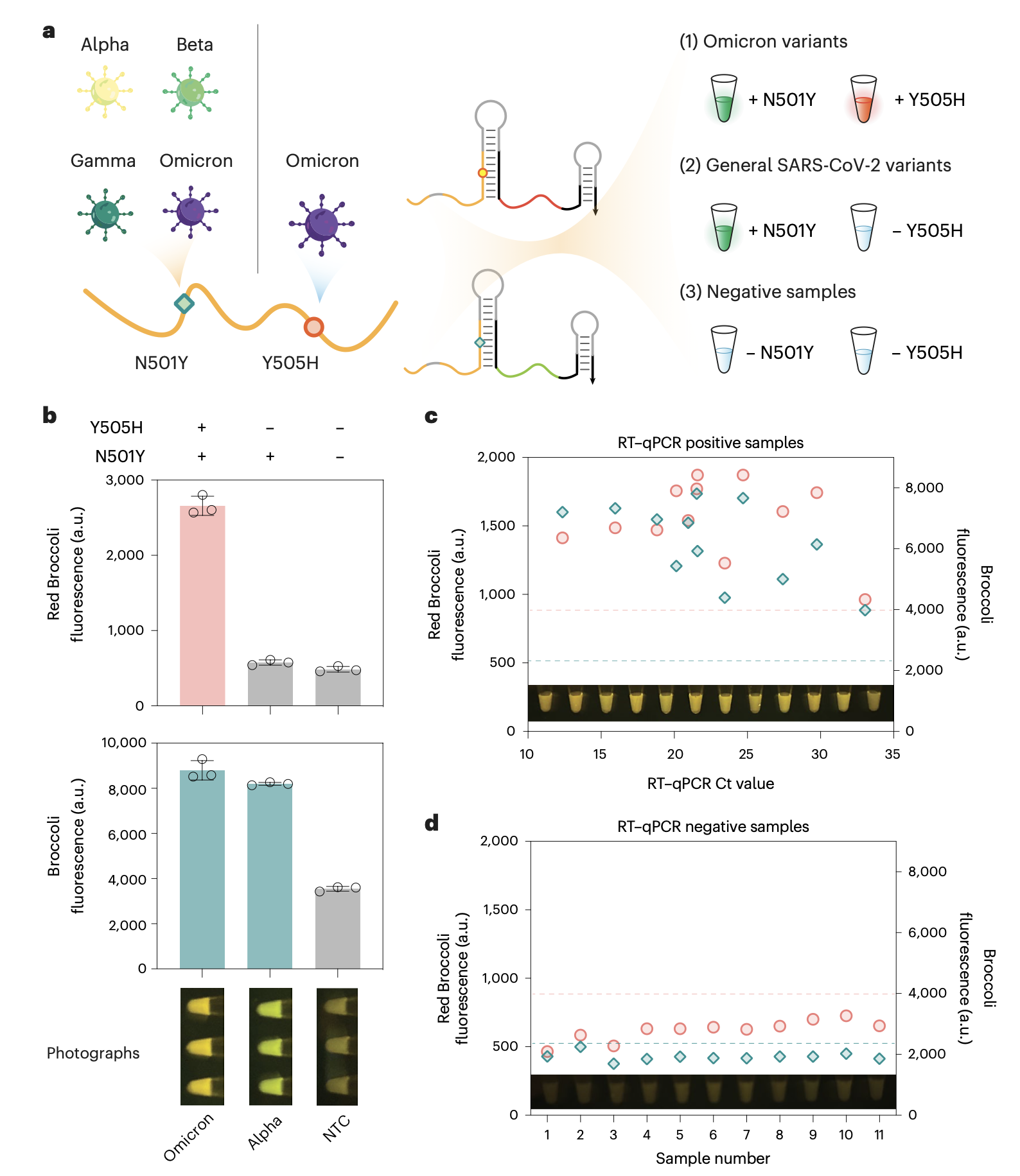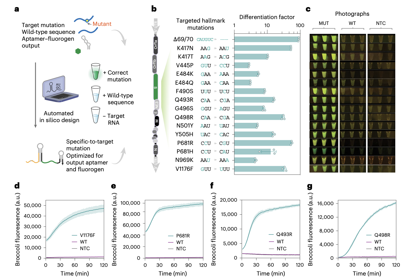 基于适配体的可编程荧光RNA开关用于快速鉴定位点突变。 单核苷酸多态性检测对遗传疾病诊断、病原体耐药性评估和感染传播防控至关重要。然而,现有检测方法在实现序列特异性识别、RNA结构稳定性和功能效能的平衡方面面临挑战。为解决这一难题,来自美国波士顿大学的Alexander Green团队开发出了一种名为FARSIGHT的计算机辅助设计RNA开关,该技术通过双趾环交换机制,可在15分钟内实现单核苷酸特异性的快速、低背景、多重检测,且无需酶参与。结合等温扩增技术后,FARSIGHT能够在阿摩尔浓度下通过强荧光信号稳健检测单核苷酸突变,并在临床唾液样本中以100%准确度区分SARS-CoV-2 Omicron与Alpha、Beta、Gamma变异株。相关成果以Programmable fluorescent aptamer-based RNA switches for rapid identification of point mutations为题,发表于2025年11月21日的Nature Chemistry期刊。论文通讯作者为Alexander A. Green教授和洪帆教授,第一作者为颜兆庆教授。