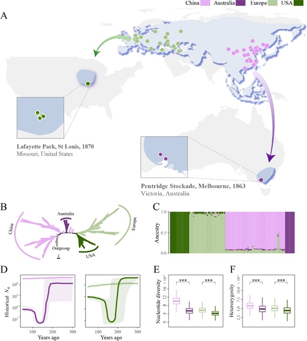 研究揭示平衡选择维系气候“预适应”储备机制。人类活动导致的物种引入事件日益频繁。经典理论认为,源于少数个体的引入种群会遭遇奠基者效应,使遗传多样性锐减、近交衰退加剧,从而阻碍其适应新环境。然而,许多物种能够突破这一遗传瓶颈,并在新环境定殖并建群。目前,学界对其适应性遗传变异保存机制尚不明晰。19世纪下半叶,欧亚树麻雀分别从欧洲(德国柏林)和亚洲(中国广东)被独立引入美国和澳大利亚,构成了两次天然的“平行引入”实验。近日,中国科学院动物研究所研究团队聚焦欧亚树麻雀,对来自原生地与引入地的235只树麻雀进行全基因组测序,并通过整合群体遗传学与生态位建模,从基因组层面揭示了该物种引入成功的机制。