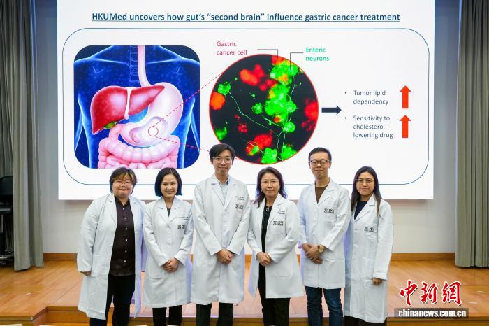 11月25日,香港大学公布,该校医学院研究团队在胃癌研究上取得突破,揭示人体消化系统中的肠神经元,会影响肿瘤生长及治疗反应。图为香港大学医学院生物医学学院副教授黄兆麟(左三)和研究团队合影。(香港大学医学院供图)