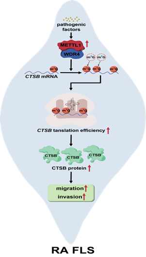 RA滑膜组织及FLS中表达升高的METTL1通过mRNA内部m7G修饰机制提升CTSB的翻译效率,增加CTSB蛋白合成,进而强化FLS的迁移与侵袭性,最终驱动滑膜侵袭及骨质破坏的病理进程。研究团队供图