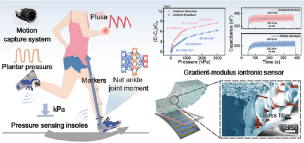 团队受到人类皮肤层状纤维网络与离子信号调控机制的启发,提出“织物微结构接触面积演化(∝P1/3)+离子浓度自适应调制(∝P2/3)”的双机制协同模型。该机制通过耦合几何接触与电化学调制两种不同的非线性效应,使整体输出关系趋近理想线性(C∝P),从根本上突破了传统“结构响应非线性”限制。基于这一机理,团队制备出新型离电式柔性压力传感器,在0MPa—1MPa的宽工作区间内,实现了线性度R2=0.997、灵敏度242kPa-1的性能,线性灵敏度因子(LSF)高达242000。团队将该传感器集成于智能鞋垫平台,建立了步态—胫骨载荷的实时映射模型,在行走与跑步测试中实现了载荷评估误差仅1.8%的高精度监测,相比传统非线性传感方案显著提升。