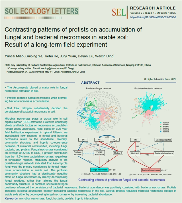 SEL Research 长期施肥下原生生物对微生物残留物累积的影响。论文标题:Contrasting patterns of protists on accumulation of fungal and bacterial necromass in arable soil: Result of a long-term field experiment