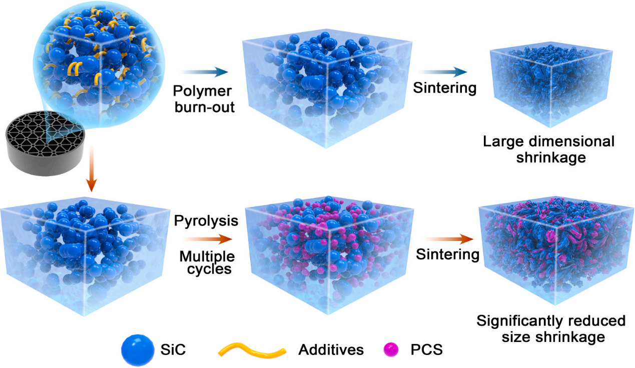 3D打印常压烧结碳化硅陶瓷研究获进展。碳化硅陶瓷结构件在半导体制造、新能源等高端装备领域的需求日益增长。然而,碳化硅陶瓷因极高的硬度和显著的脆性,使其难以通过传统加工方法制造复杂结构件,这一技术瓶颈制约了其在高端装备中的应用。因此,3D打印技术成为突破碳化硅陶瓷制造瓶颈的关键途径。目前,3D打印方法制备的碳化硅陶瓷主要面向缺陷容忍度较高的反应烧结碳化硅陶瓷,但反应烧结碳化硅陶瓷中通常存在>30vol%的残余游离硅,硅熔点低于1410℃,导致其高温性能受限,进而限制了3D打印碳化硅陶瓷在极端服役环境下的应用场景。