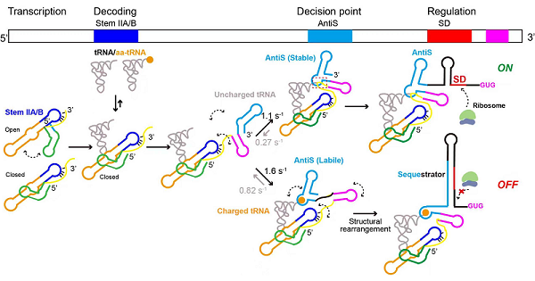 这一研究提出了T-box核糖开关的共转录调控模型,阐明了其在转录过程中分步识别tRNA、鉴别氨酰化状态、动态切换构象并最终调控基因表达的完整动态过程。