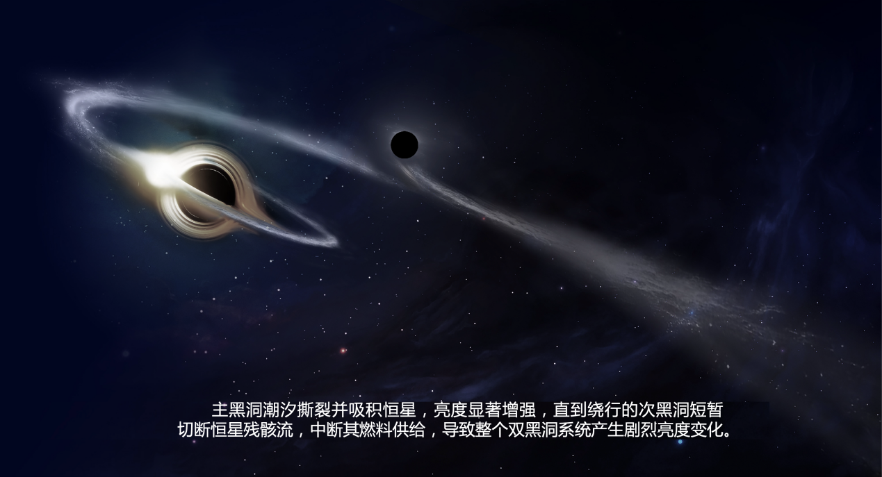 这种现象预示着可能是一例发生在超大质量双黑洞系统中的潮汐撕裂恒星事件。薛永泉解释,与普通的单黑洞潮汐撕裂恒星事件不同,当一颗恒星被主黑洞撕裂,恒星残骸流可能会被次黑洞干扰,导致无法正常回落到主黑洞,物质供给的中断导致光度骤然下降;当次黑洞远离后,恒星残骸流又能正常回落到主黑洞,于是主黑洞继续吸积残骸从而恢复光度。