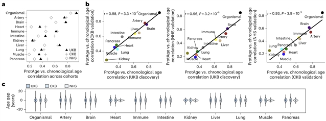 该研究基于大规模血浆蛋白质组学构建了全身 + 十大器官系统的蛋白质组衰老钟体系,并首次在中国 (China Kadoorie Biobank)、英国(UK Biobank)、美国 (Nurses Health Study) 三大前瞻性大型人群队列中系统验证其在疾病预测与寿命评估中的效能,为器官定向的抗衰老干预提供了可量化框架。