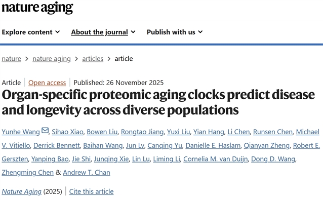 为了解决这些关键问题,由牛津大学、哈佛大学及Broad Institute of MIT and Harvard的王云鹤博士及肖思昊博士领衔,联合牛津大学人口健康系、哈佛大学医学院和北京大学等多中心团队,于2025年11月26日在《自然—衰老》(Nature Aging)发表论文—— Organ-specific proteomic aging clocks predict disease and longevity across diverse populations。