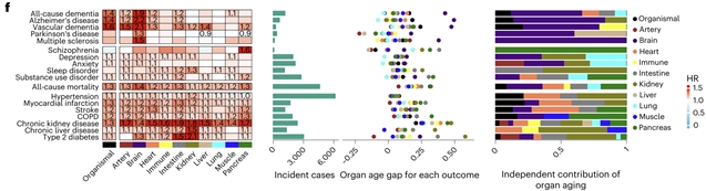 在此基础上,作者系统评估了各器官衰老与神经退行性疾病(阿尔茨海默病及其他痴呆)、精神疾病、心血管疾病、代谢性疾病以及全因死亡的前瞻性关联。大脑衰老钟在多种疾病和死亡预测中尤为突出:大脑 age gap不仅预测未来痴呆和认知衰退,且独立于APOE基因型等已知风险因素,且在控制时间年龄和其他器官衰老后,仍是最强的死亡风险指标之一。心血管 / 动脉、肾脏和免疫系统的加速衰老与冠心病、心衰、高血压、糖尿病风险升高有关,表明各器官蛋白质组衰老既指向自身疾病谱,也共同构成多病共存和整体健康状况的生物学基础。