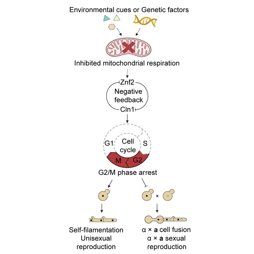 研究团队通过大规模T-DNA插入突变筛选,发现了一系列同性生殖能力增强,且双性生殖能力明显减弱的突变体,这暗示两种有性生殖模式之间存在相互抑制的关系。基因组测序结果显示,这些突变体的T-DNA插入位点富集于呼吸作用相关基因中。后续功能实验表明,抑制呼吸作用可上调关键转录因子Znf2的表达,进而直接抑制B型细胞周期蛋白Cln1,最终导致细胞周期停滞于G2/M期。这种细胞周期停滞状态一方面促进了同性生殖发育,另一方面抑制了双性生殖过程中的细胞融合过程。