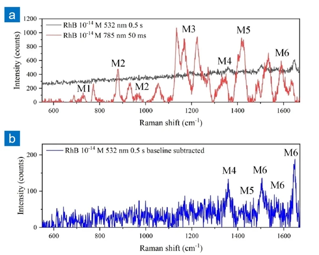 研究采用785 nm近红外激光作为激发源,巧妙地避开了RhB、R6G和CV分子在可见光激发下产生的强荧光背景干扰。相比于532 nm激光激发,785 nm激发不仅消除了荧光基线污染,还使拉曼信号强度提高约100倍,信噪比得到显著改善 (图2)。这种荧光抑制策略与电磁增强和化学增强的协同作用相结合,为实现超低浓度的单分子检测提供了关键的技术保障,成为推进SERS向SM-SERS领域发展的重要补充途径。