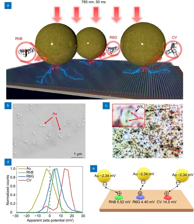 图1 SM-SERS基底的基本结构和工作机理。(a) SM-SERS信号快速形成示意图;(b) SM-SERS衬底的SEM图像;(c) 样品在微拉曼光谱仪下的光学图像,红色框中突出显示的区域表示金纳米颗粒与WS2二维材料结合的区域;(d) 金纳米颗粒胶体、RhB 溶液、R6G 溶液和 CV 溶液的 Zeta电势;(e) 金纳米颗粒被滴加后,被静电力吸引向带正电分子骨架趋近的示意图