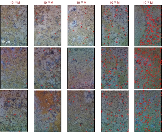 通过在5 mm×5 mm大面积基底上进行系统性的拉曼成像研究,验证了SM-SERS活性位点在宏观尺度上的均匀分布特性。在10-16 M的极低浓度下,每个60 μm×90 μm微区内可稳定观察到3~4个拉曼活性位点,在10-14 M浓度下增加到10~20个活性位点,展现出良好的浓度响应特性。通过对不同浓度(10-16 M至10-12 M)的系统研究发现 (图3),在单分子检测范围内,所有拉曼活性位点均表现出相似的信号强度水平,证实了真正的单分子检测能力。该方案成功实现了对罗丹明B (RhB)、罗丹明6G (R6G)和结晶紫(CV)三种典型拉曼分子的通用检测,具有检测灵敏度低(10-16 M)、检测速度快(50 ms)、稳定性好、大面积均匀等突出优势,为协同增强SM-SERS的实际应用提供了重要支撑。