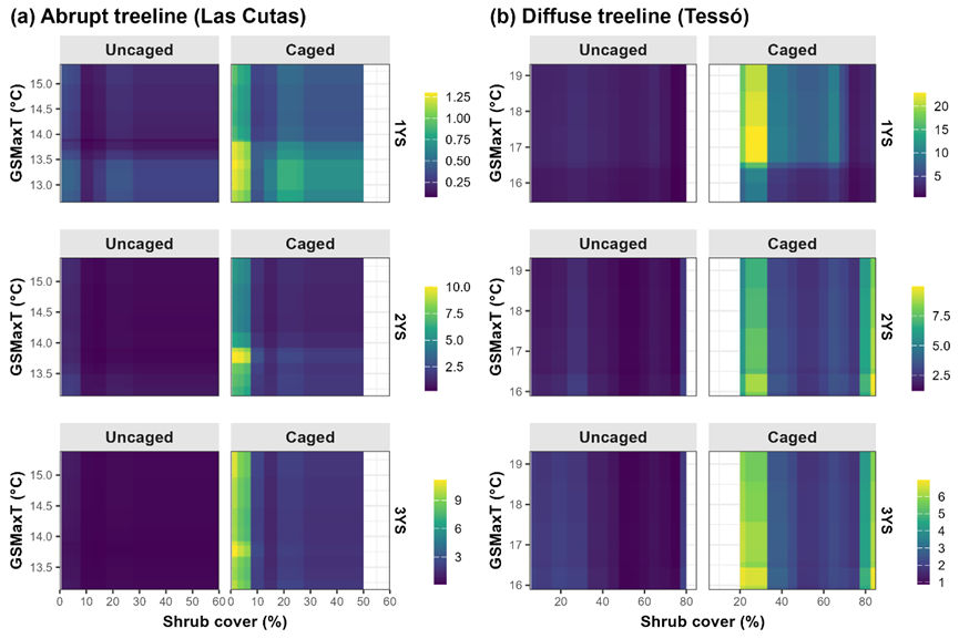 研究表明,种子可用性是两类树线幼苗更新的共同初始限制因子。播种可促使幼苗大量萌发,但随后几年幼苗存活率快速下降,该模式在渐变型树线中更显著。网笼防护则明显提高了幼苗密度,表明植食压力是关键生物限制因子。树线类型调节着生态过程的强度,渐变型树线对种子供给和植食压力表现出更高敏感性。灌木对幼苗影响具有双重性,即灌木可通过竞争限制幼苗生存,而在低温或风雪胁迫更强的环境中,可通过改善微环境促进幼苗存活。同时,极端气候事件导致新生幼苗的存活率大幅下降,这表明气候变暖提高了幼苗在夏季高温与干旱条件下的死亡风险。