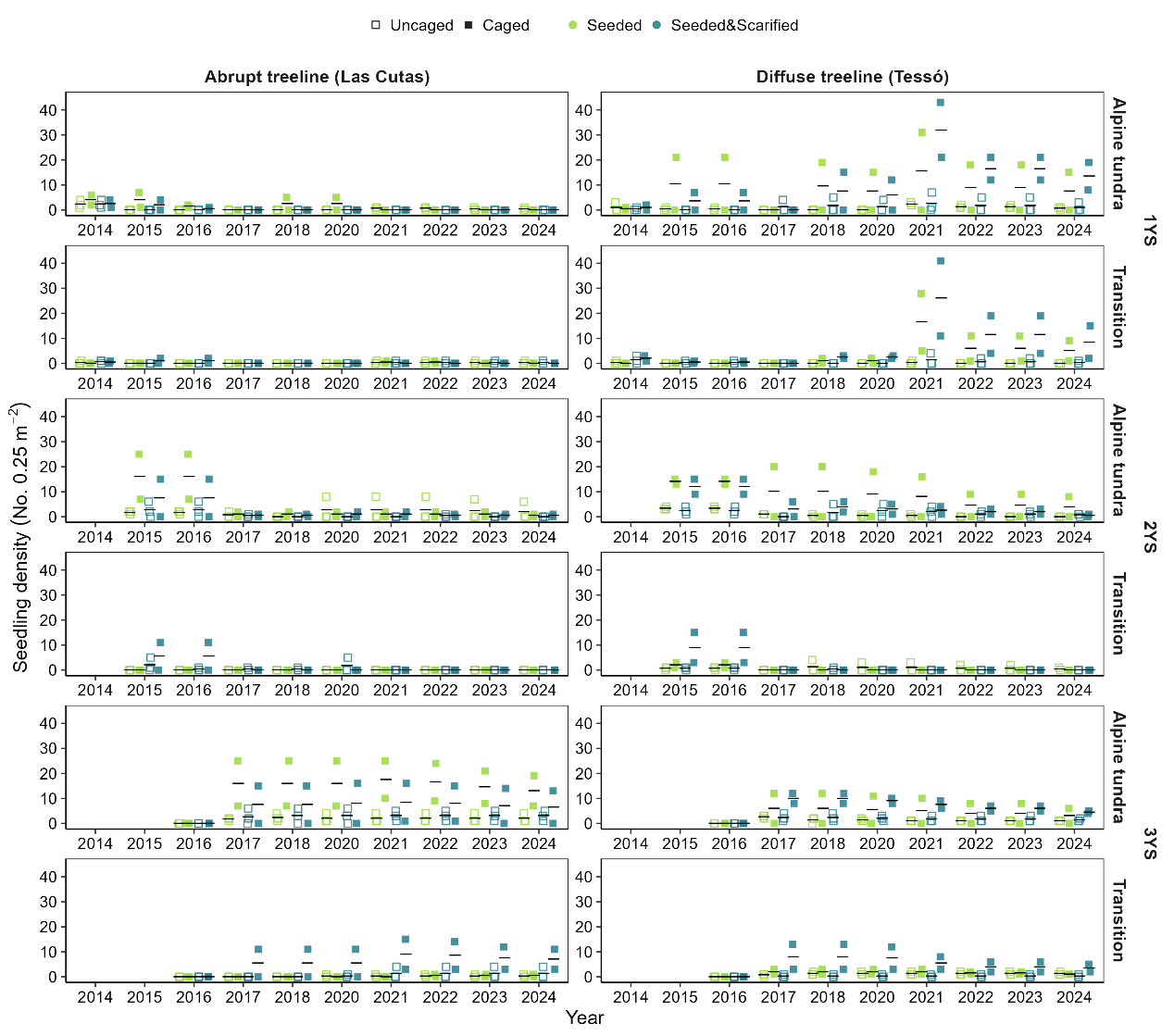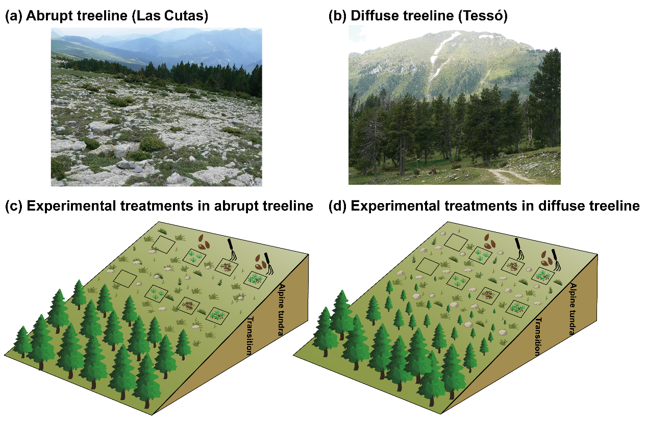 为揭示驱动树线动态的关键生态过程,中国科学院青藏高原研究所研究团队等,选取比利牛斯山脉的欧洲山松突变型与渐变型树线作为研究对象。实验设计包含控制、播种、松土及“播种+松土”四种处理,并在部分播种样方中设置网笼,以排除植食性动物。同时,研究通过2013年至2024年间的分批播种与持续监测,探究了不同环境条件与生态因子对树线幼苗更新的相对影响。