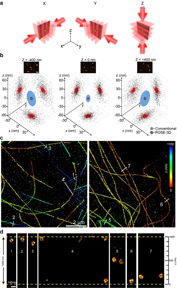 12月2日,中国科学院生物物理研究所研究团队,研制出三维干涉定位显微镜(ROSE-3D),并在单分子定位成像领域,实现了基于相机的纳米尺度三维各向同性分辨率。团队通过设计基于光电偏转器的高速切换照明光路,使ROSE-3D在X、Y、Z三个方向同时引入干涉光,实现了小于1微秒的干涉条纹切换时间。