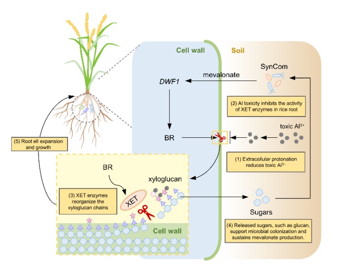 研究发现,耐酸铝合成菌群可特异性激活水稻木葡聚糖内转糖基酶(XET)的活性,进而重塑根细胞壁中的木葡聚糖结构,降低铝在细胞壁结合位点的积累,使根中铝含量降低47.5%。同时,该微生物群落通过甲羟戊酸途径,促进了油菜素甾醇(BR)的生物合成。研究通过结合XET缺陷突变体、BR缺陷突变体的遗传证据证实,该菌群可向根尖供应BR前体,并通过维持根细胞内激素稳态,直接驱动细胞壁重塑,进而与XET介导的木葡聚糖结构调整形成协同效应,有效缓解了铝毒对水稻根系的损伤。