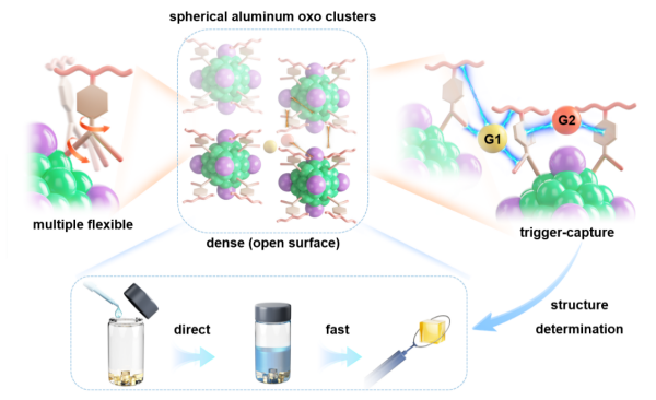 近日,中国科学院福建物质结构研究所在前期水滑石型铝氧簇、阿基米德笼状铝氧簇和环状铝氧簇等研究的基础上,借鉴胶束自组装原理,采用柔性位阻的丙磺舒配体和无机孤对电子“共封装”策略,实现了球形铝氧簇(SAlOC-1)的精准构筑。