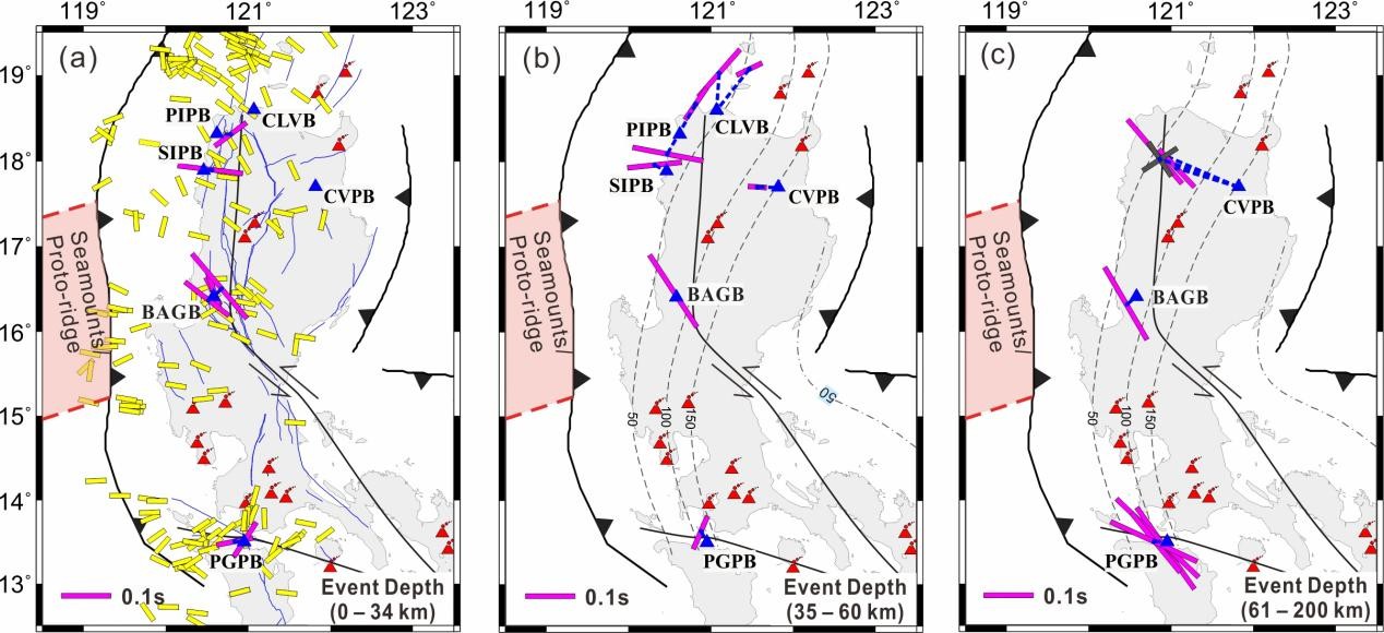 研究团队利用近震S波分裂方法,结合频率–延迟时间依赖性分析,构建了从地壳到上地幔150千米深度的各向异性分布特征。结果显示:在海山俯冲区,快波极化方向整体垂直于海沟走向,且延迟时间随频率显著变化,指示强烈的定向裂隙系统与流体活动。