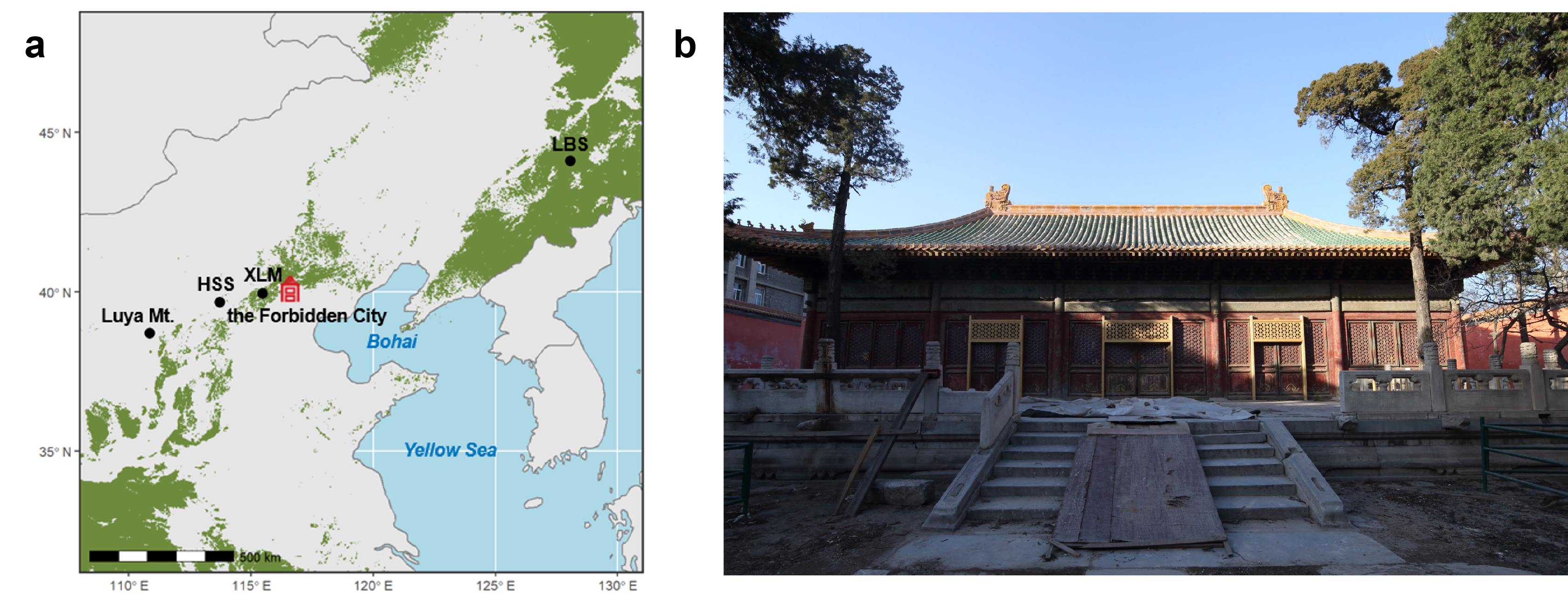 (a)采样地点以及参考树轮氧同位素年表的位置(b)九天应元雷坛殿的外观