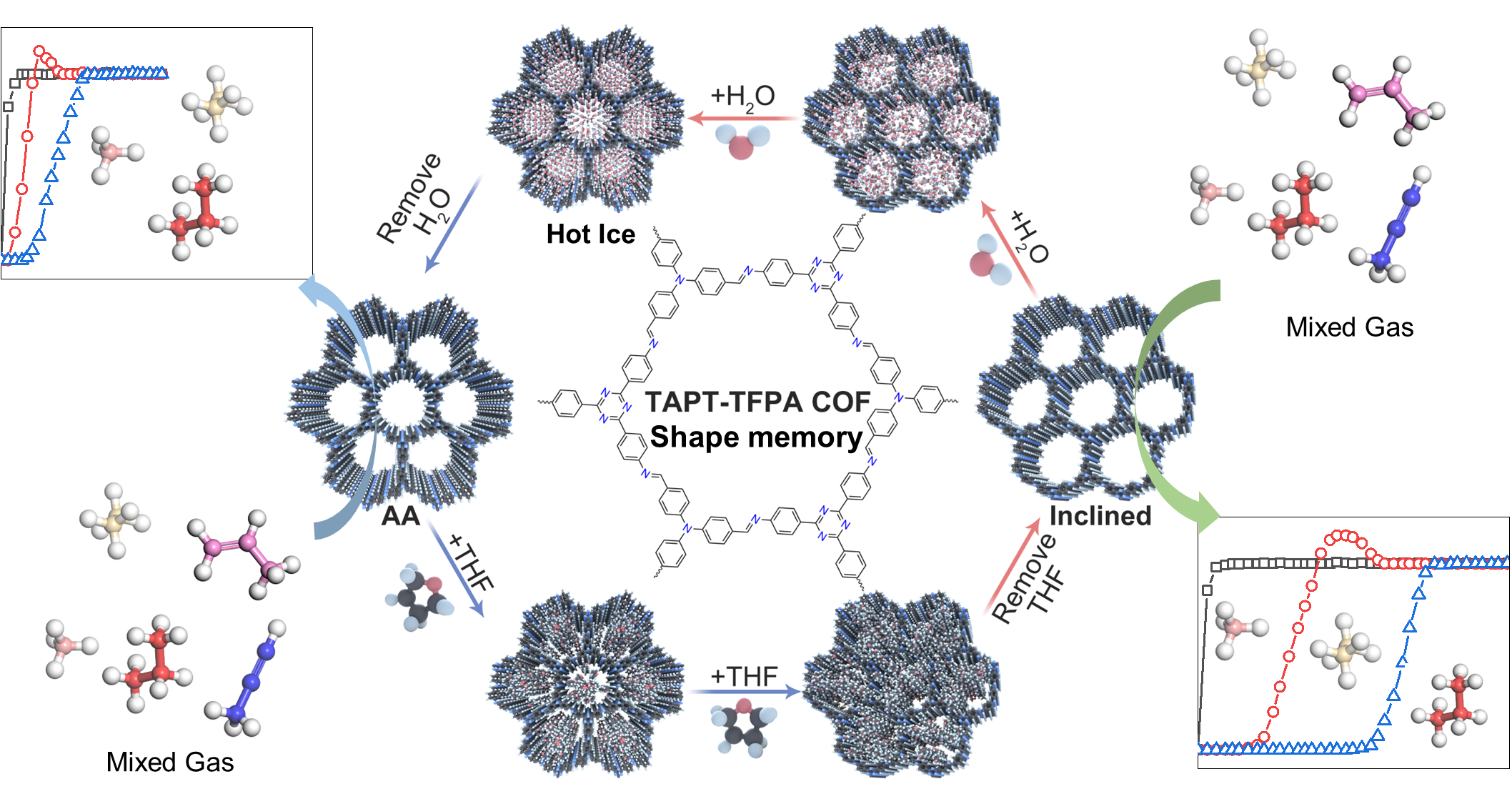 团队提出的“纳米空间限域相互作用”策略,实现了2D COF层间可逆滑移的调控。以AA层间堆叠的2D TAPT—TFPA COF为起始材料,在其一维纳米孔道中引入四氢呋喃、乙腈或丙酮等异质分子后,样品从AA层间堆叠转变为层间滑移相,其晶体c轴与a(b)轴夹角由近90°降至71°,当异质分子去除后,滑移相仍稳定存在。反之,在层间滑移相的2D TAPT—TFPA COF一维纳米孔道中引入水分子,样品逐渐转变为AA堆叠相,当水分子去除后,堆叠相仍保持稳定。
