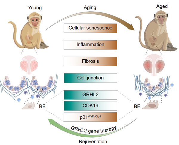 近期,中国科学院动物研究所研究团队等,解析了灵长类前列腺衰老的关键细胞与分子调控网络,揭示了基底上皮细胞中GRHL2-CDK19分子轴失活,可通过激活p53-p21信号通路,驱动前列腺衰老。基于该发现,团队进一步开发了靶向GRHL2的基因治疗策略,在动物模型中缓解了前列腺衰老相关表型,完成了从机制解析到干预策略的闭环研究。