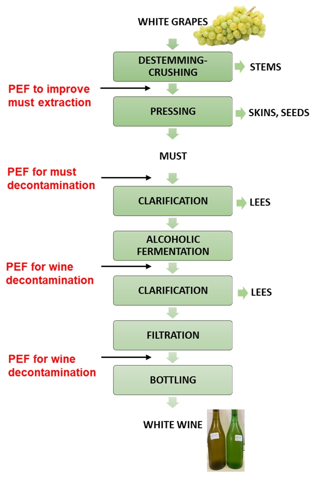 图为白葡萄酒酿造及脉冲电场技术 (PEF) 在不同生产阶段的潜在应用