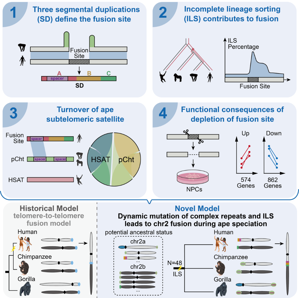 染色体数量差异一直被视为灵长类演化中最醒目的标志之一。黑猩猩、大猩猩等大猿拥有24对染色体,而人类仅有23对,根源在于两条祖先状态染色体2a与2b在演化过程中发生的头对头融合,形成了现代人类的2号染色体。长期以来,这一融合何时出现以何种结构方式形成是否影响了人类特有生物学特征等问题困扰着遗传学与人类学领域的科学家。然而,由于融合区域的重复序列极度复杂,加之早期分析手段有限,这些问题始终未被解答。